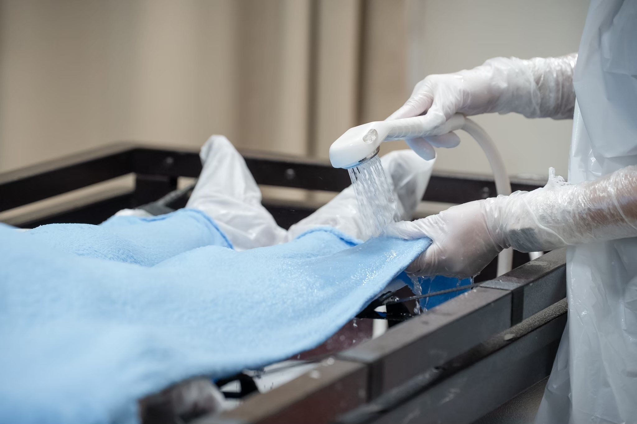 退去臨終衣著,覆以大毛巾保護隱私,以常溫水淋浴